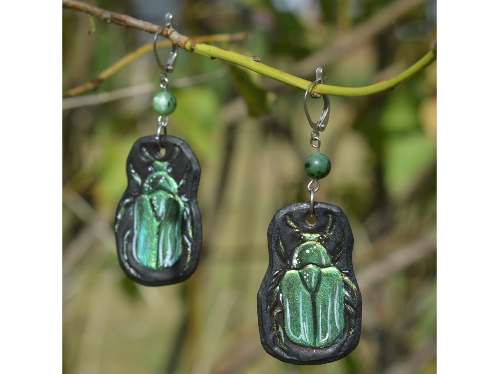 Kožené náušnice s broukem zlatohlávkem, minerálem a stříbrnými komponenty. Háčky z chirurgické ocele.