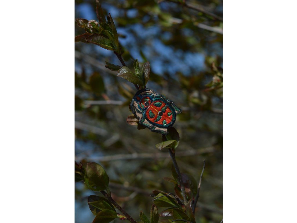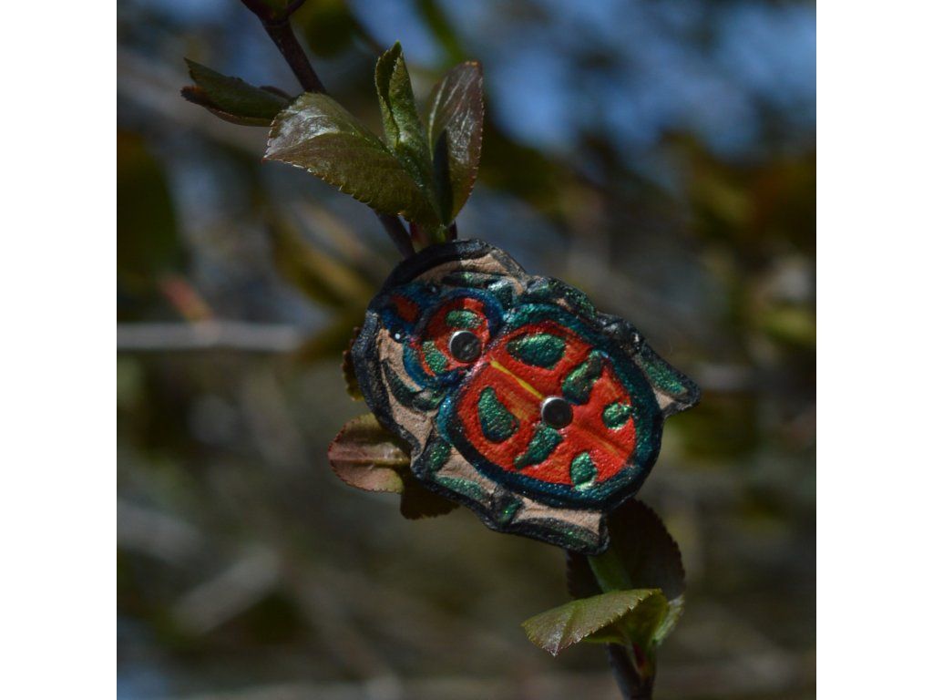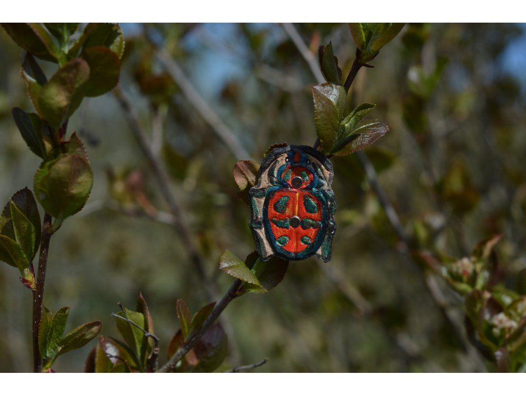 Malá třpytivá brož s broukem Tectocoris diophthalmus.