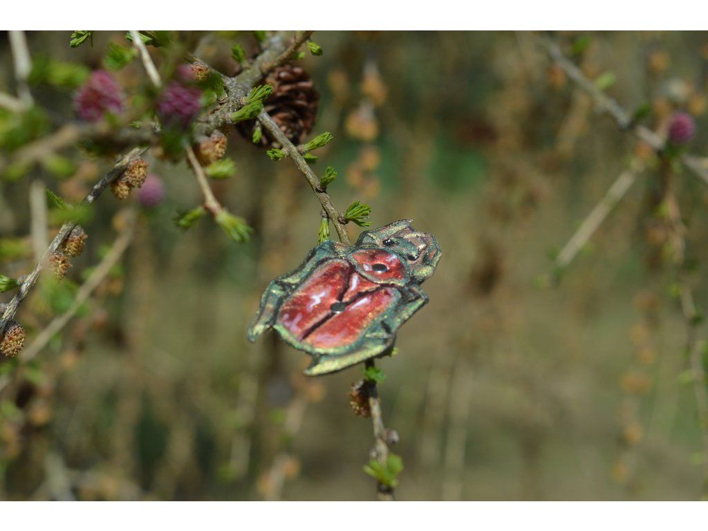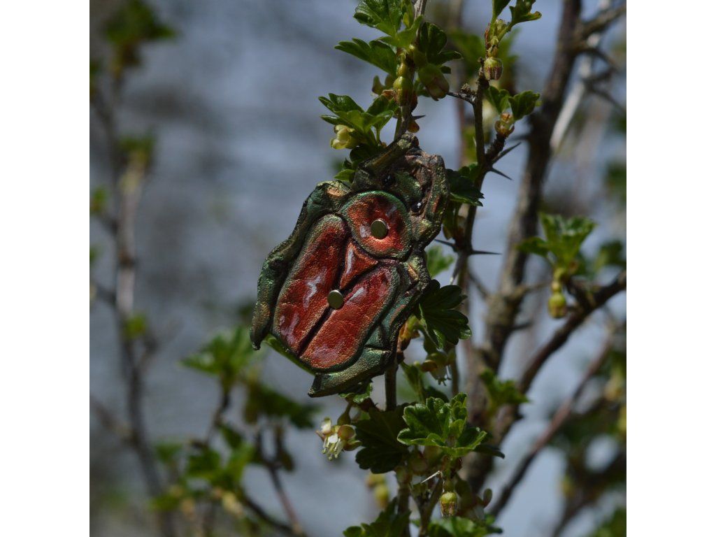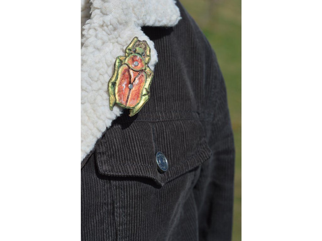 Kožená spona se třpytivým, malovaným broukem na brožové sponě 4cm.
