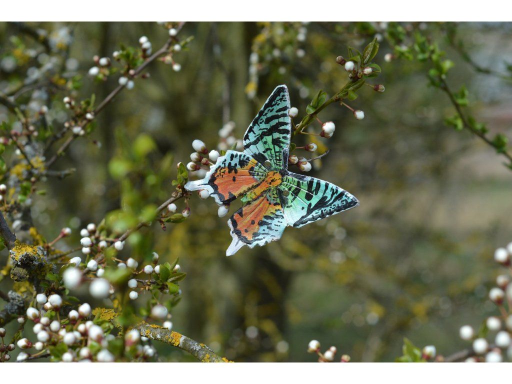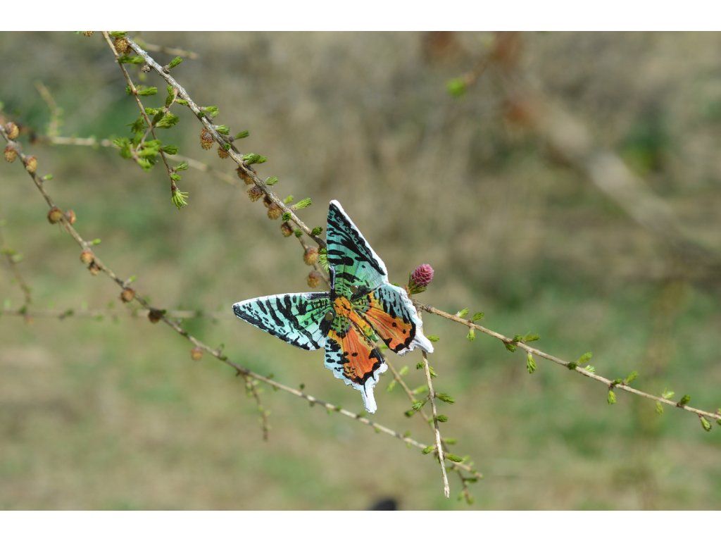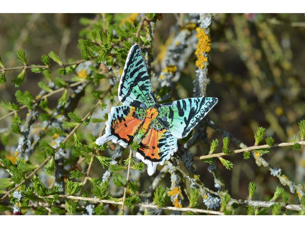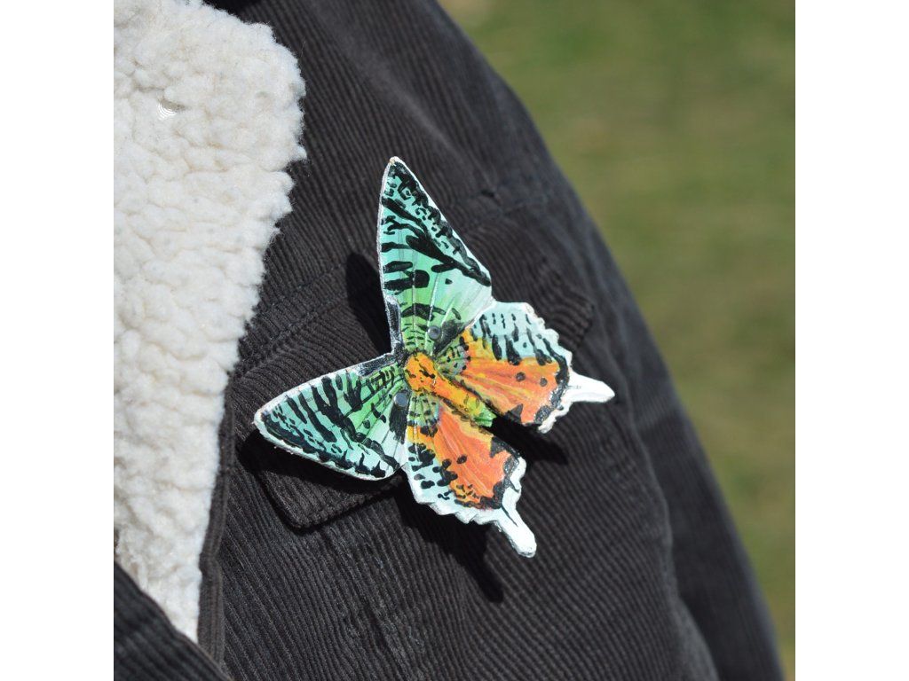 Brož Komety zářivé (Chrysiridia rhipheus). Velká, nepřehlédnutelná brož s třpytivými odlesky, na brožovém můstku 4cm.