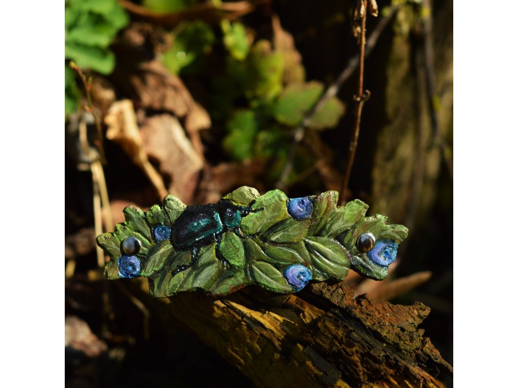 Spona do vlasů, kovová spona má délku 8cm, celková délka je tak o něco větší. Vyřezávaná a malovaná z inspirace lesem, borůvčím a chrobákem lesním. Chrobák mění barvu odlesku dle úhlu světla. :-)
